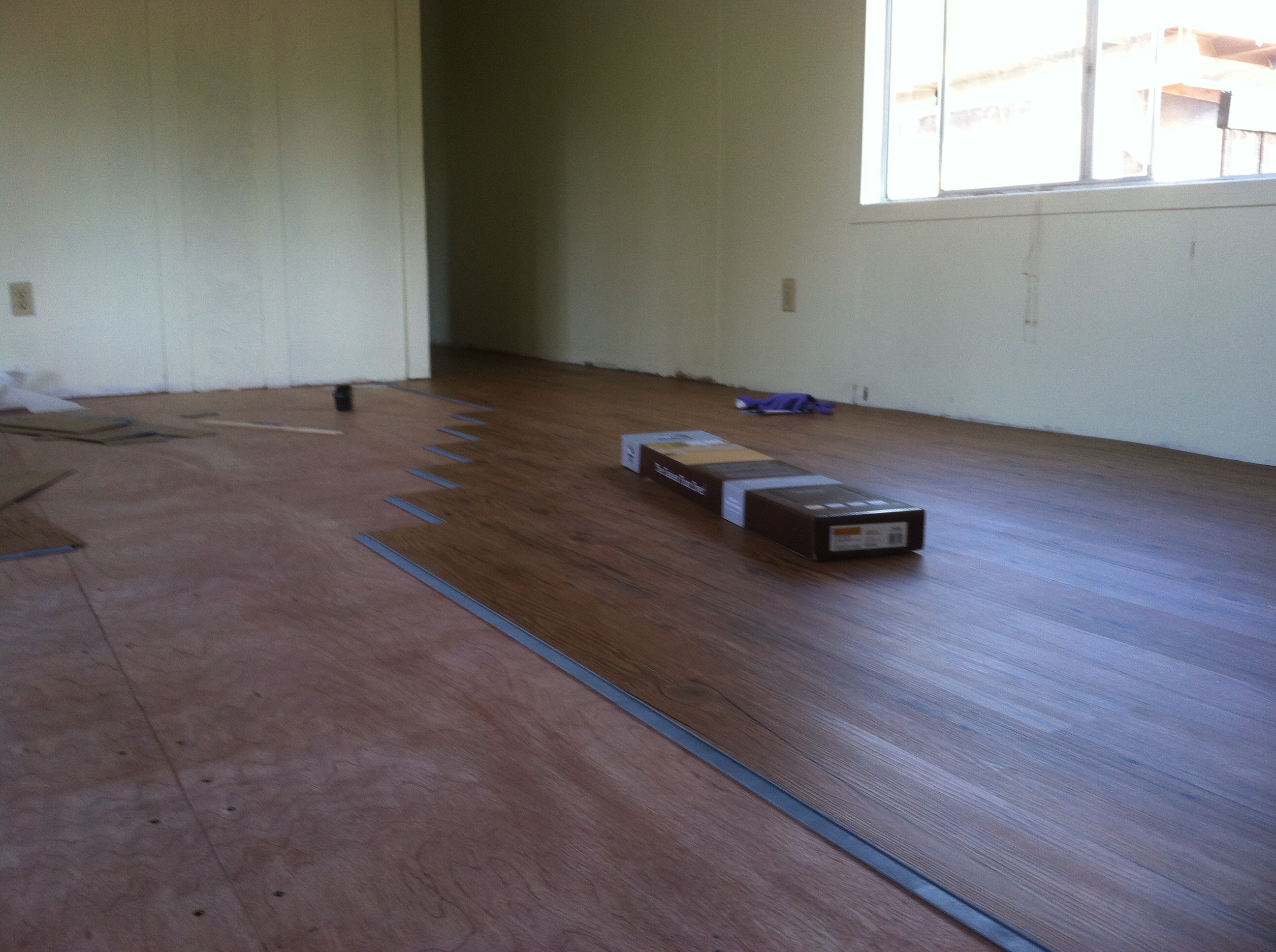 Once we got the right product down in the bedroom, the place began to smell better.  Jeffrey began to tackle the small whole in the floor under the window.  It was about 2 feet wide and 3 feet long.  I totally expected this type of repair for a trailer as old as this one.  Once he got it repaired, we then laid down 1/4 in plywood in the living room and vinyl flooring.  I love the Allure vinyl flooring planks.  They go down so easy and look amazing as well.